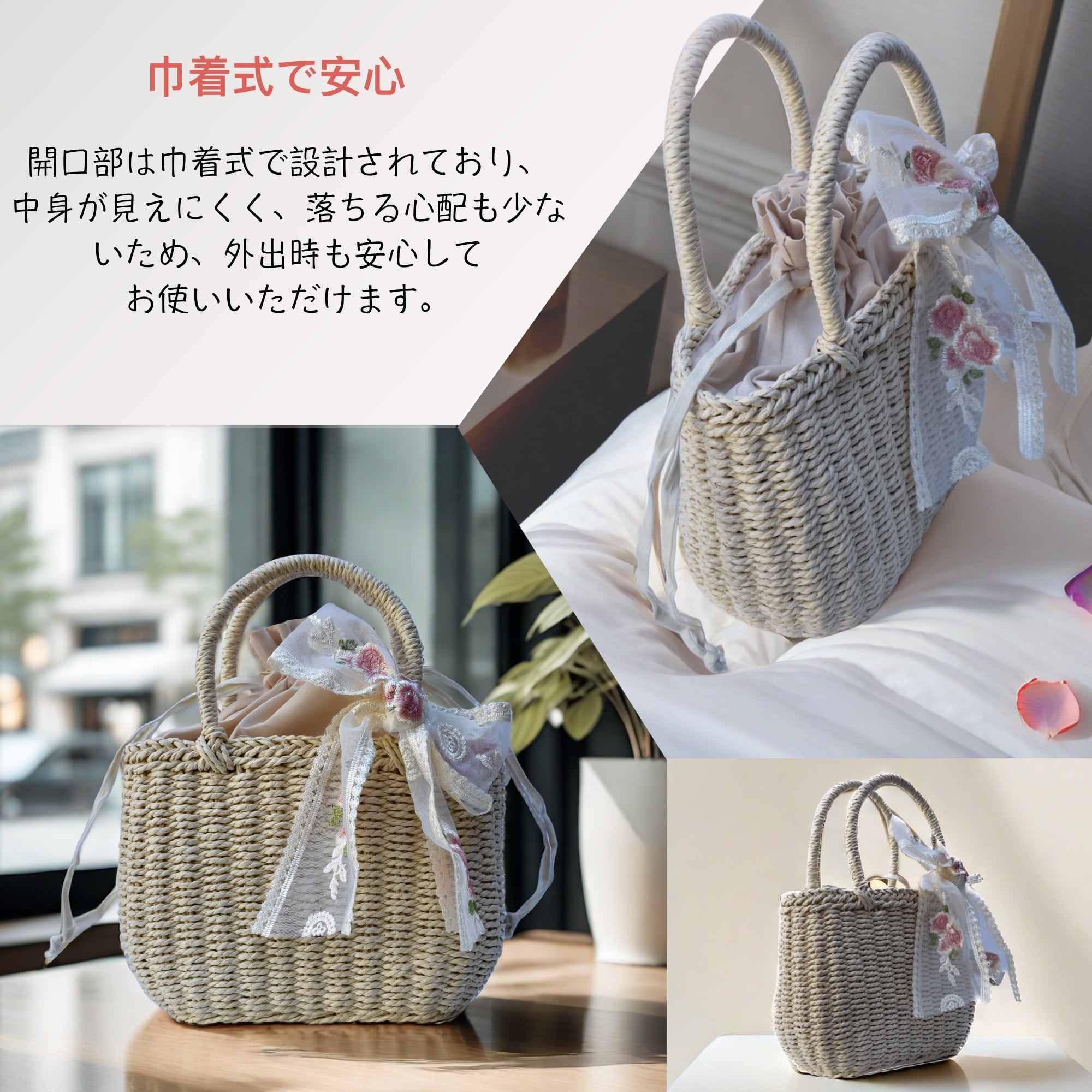 かごバッグ 草編みバッグ レディース 巾着式 ハンドバッグ 編みバック 手提げバッグ ストロー バッグ シンプル おしゃれ 可愛い 夏用バッグ 浴衣向け ビーチ 海水浴 旅行用 夏 花火大会 ナチュラル
